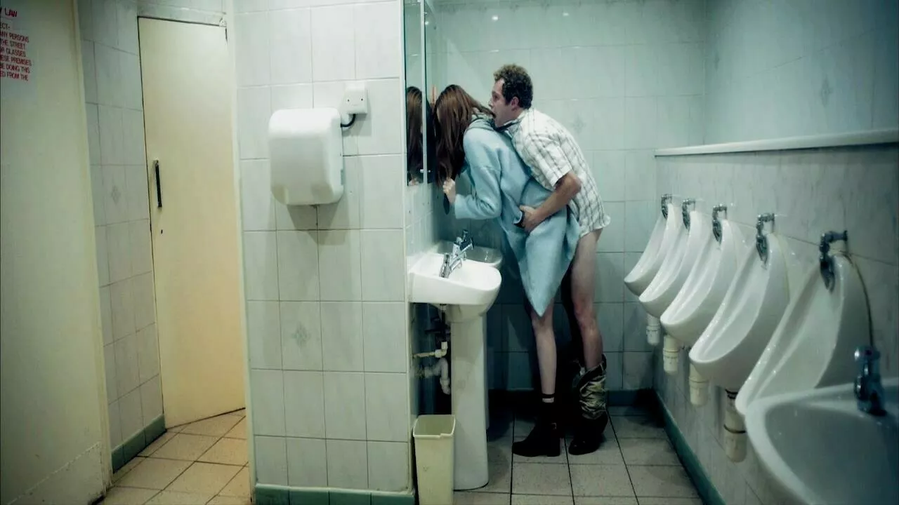 sexy brunette gives boyfriend sensual blowjob in hotel mirror