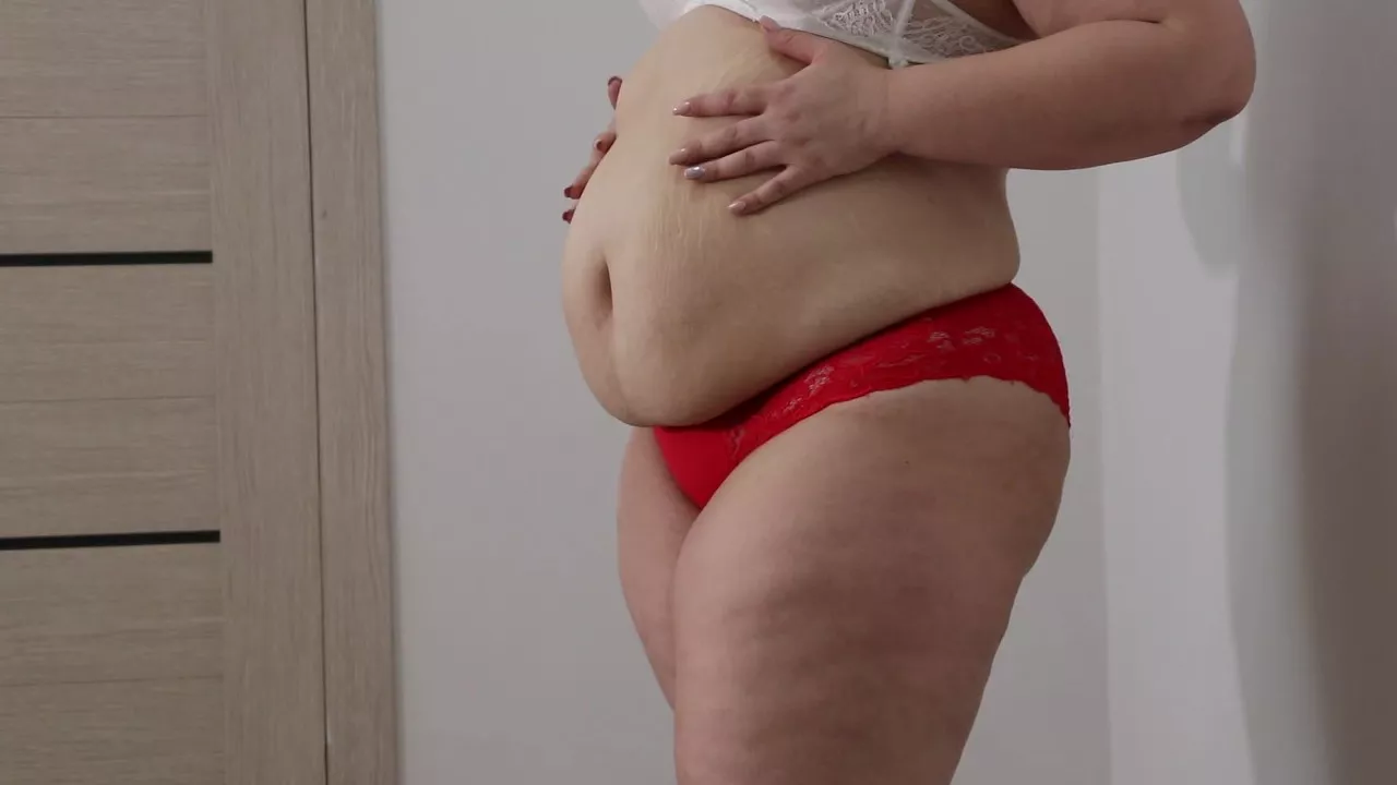 BBW shakes stuffed belly and fat ass in panties. Fetish.